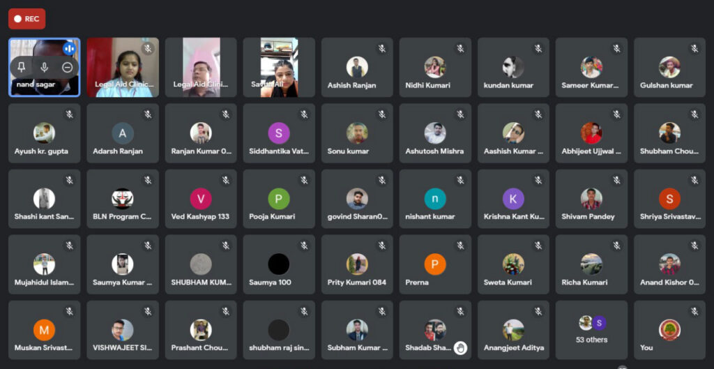 The second speaker of the program, Advocate Savita Ali, Advocate Patna High Court and Director Bihar Legal Network, highlighted the work of Bihar Legal Network and gave valuable information about the real state of affairs at ground level. Pointing out the failure of the government in implementing the existing laws, she presented many examples and told how to help the victims. She advocated the practice of putting one’s views as an advocate clearly in the court and told how people can be saved from the atrocities of the police. She succinctly explained how lack of awareness about compensations, remedies and other legal tools results into non-accessibility of the benefits, especially to women victims, that Legal System in our country aims at providing and also categorically highlighted other loopholes like red-tapism that required to be addressed. Besides both the speakers also answered queries of students and broke the wall of ambiguities and ignorance, standing before the law students.