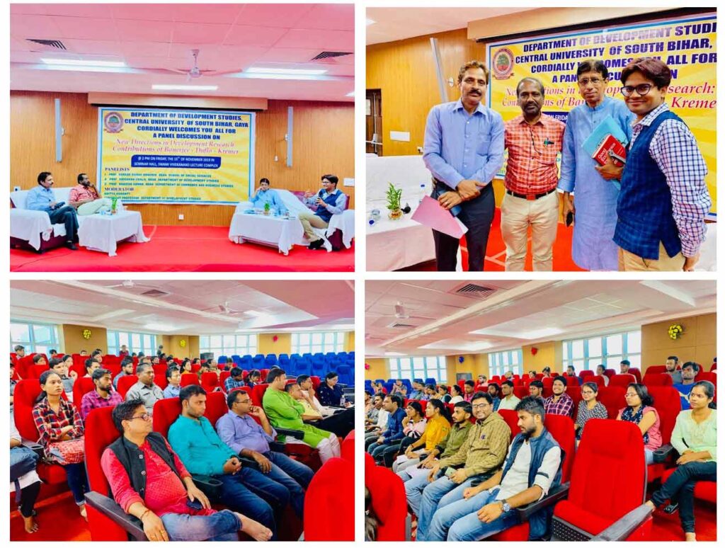 The Department of Development Studies of Central University of South Bihar (CUSB)   organized a Panel Discussion on “New Directions in Development Research: Contributions of Banerjee, Duflo and Kremer” on November 15, 2019.  The discussion was organized in the backdrop of awarding Nobel Prize in Economics to Michael Kremer, Abhijit Banerjee and Esther Duflo.